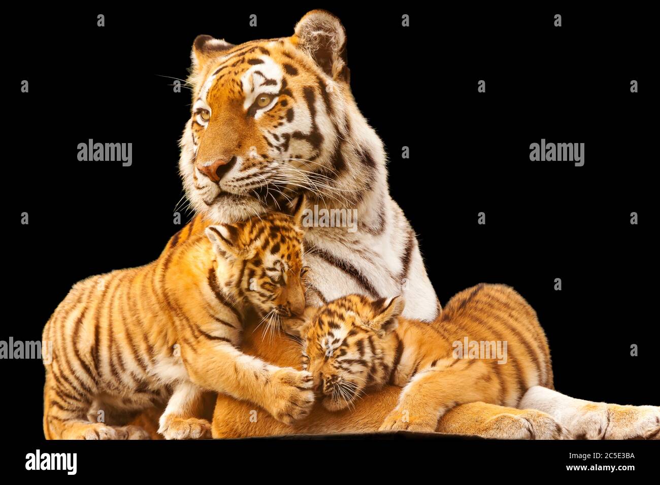 Amur Tiger Panthera Tigris Mother And Two Cubs Together Stock Photo Alamy